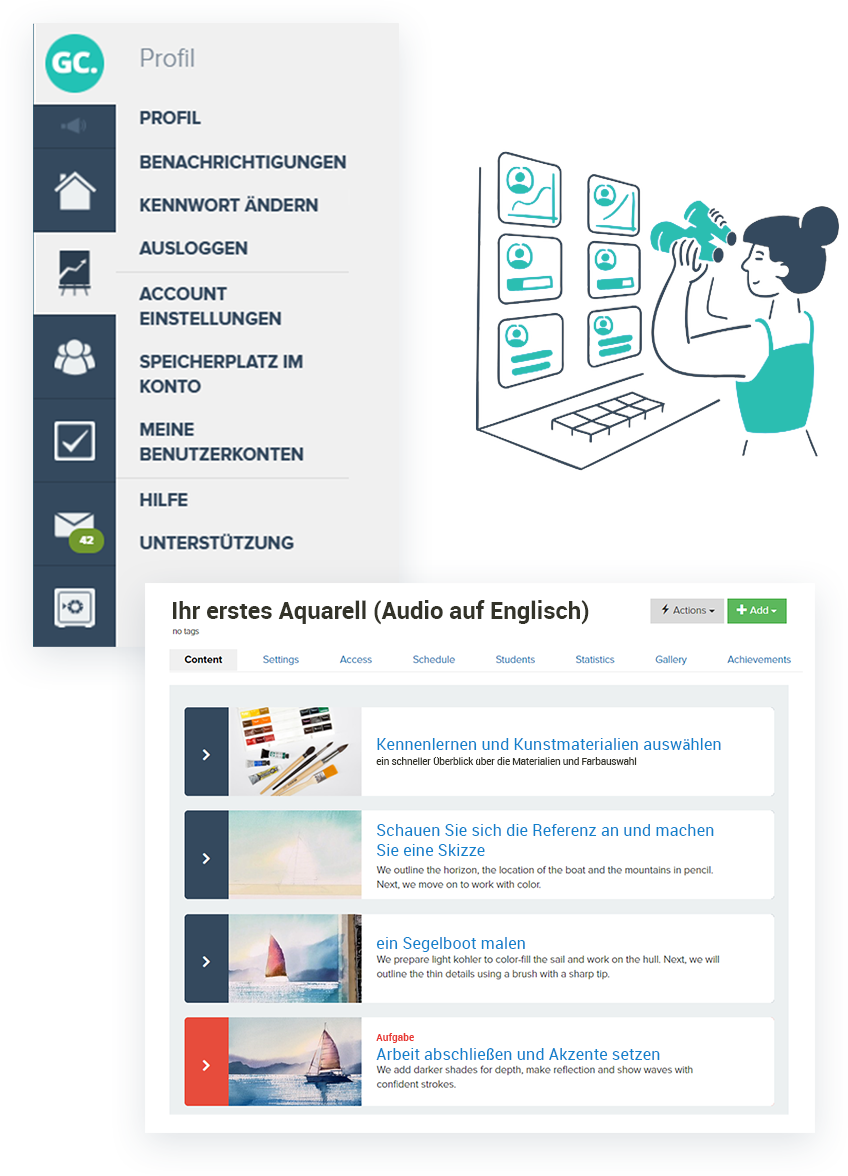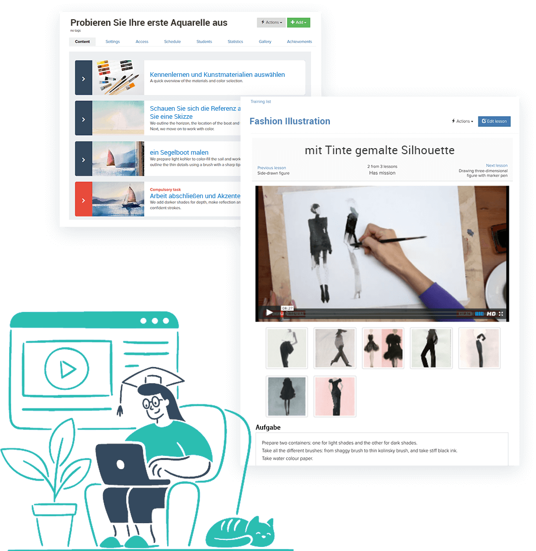 Ihre Kursteilnehmer werden niemals mehrere Services zur Verfolgung Ihrer Unterrichtssitzungen brauchen - GetCourse ™ bietet den Schülern ein komlettes persönliches Benutzerkonto, damit sie durch alle allgemeinen Lernmaterialien mit Hilfe ihres Computers, Laptops oder Smartphones problemlos navigieren können.