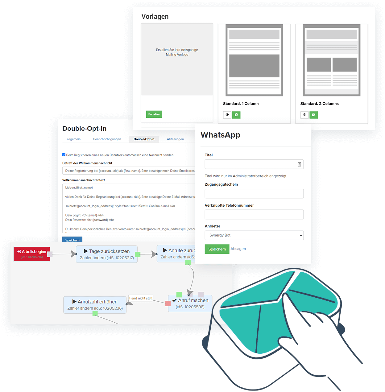 - Kommunikationsmodul (E-Mail, SMS und Messenger) — erstellen Sie zahlreiche personenbezogene elektronische Briefe, SMS und Mitteilungen (in WhatsApp, Telegram, Facebook Messenger) und versenden Sie diese zu jeder Zeit und sogar automatisch.